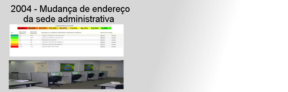 Mudança de endereço da sede administrativa para a R Alferes Magalhães em São Paulo, primeira integração com base de dados de terceiros ee introdução do Sistema Score e do módulo administrativo/financeiro.